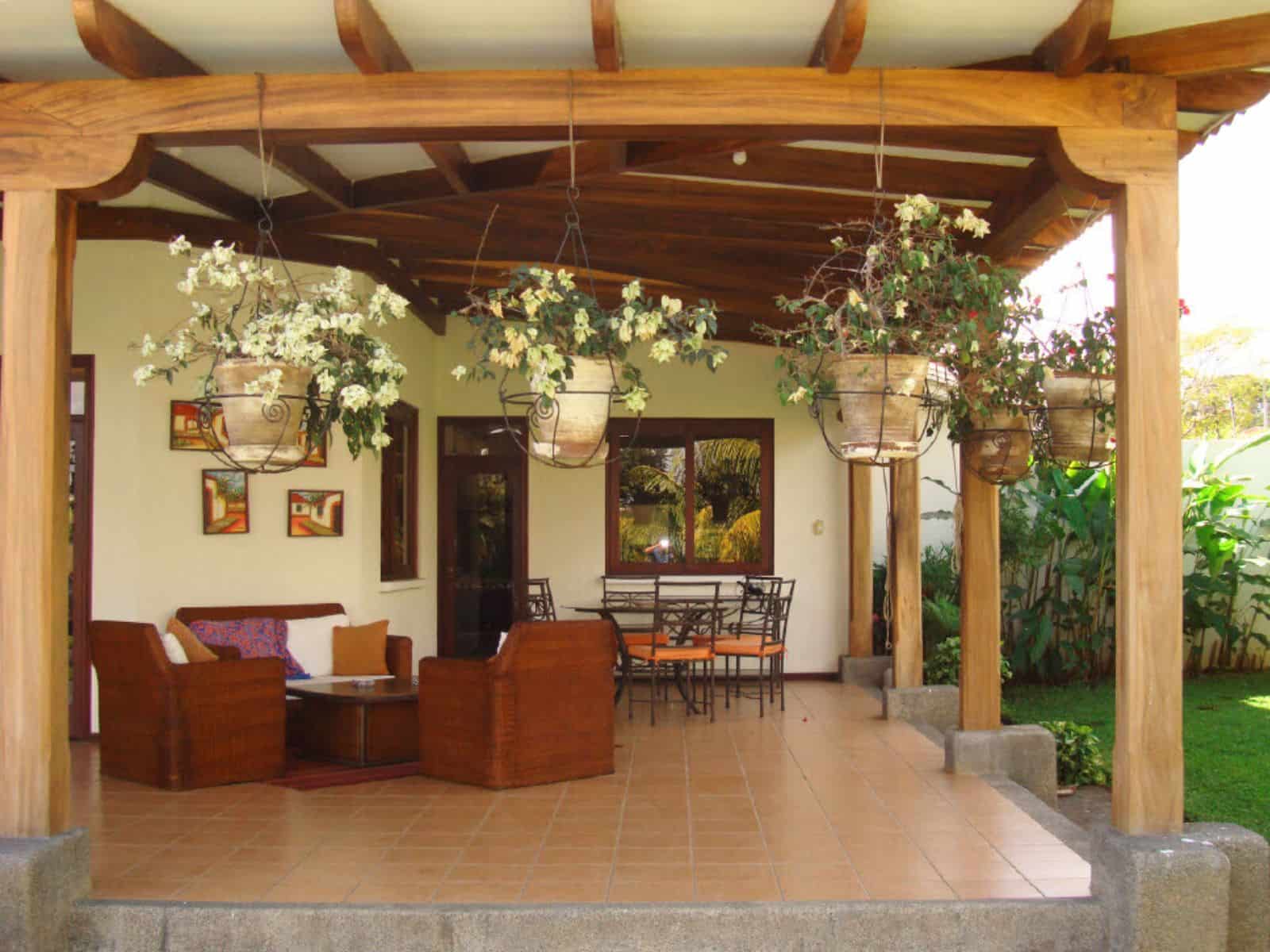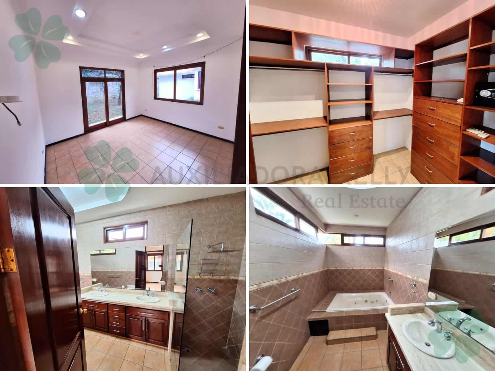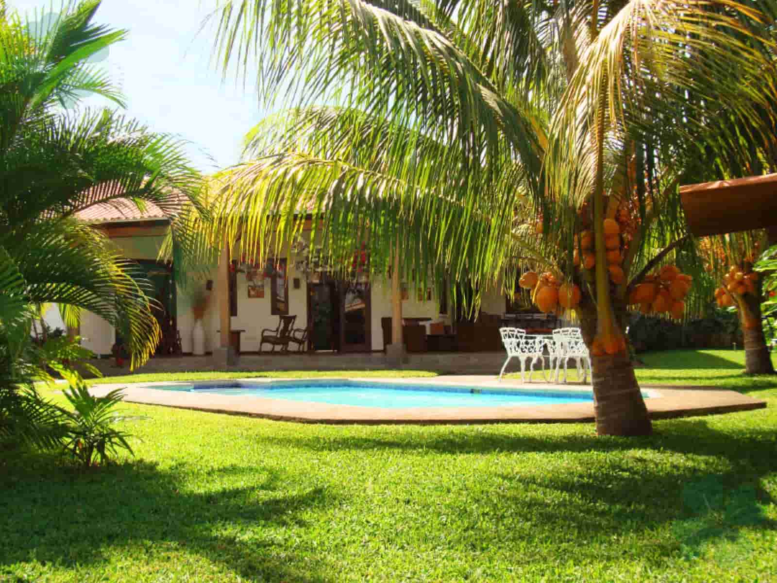 3 habitaciones cada una con aire acondicionado y ventilador de techo (habitación principal con vestidor, baño privado, jacuzzi y ducha. Dormitorios secundarios con baño compartido y closet). Sala de estar con puerta de salida a jardín interno y aislante en techo. Cocina con top de granito, 2 lavaderos de acero inoxidable, muebles de madera, desayunador y alacena. Sala-Comedor con acceso a cocina y terraza, con material aislante en techo y lámparas colgantes. Baño de visitas. Terraza techada, con maderas finas, con vista a la piscina y a los jardines. Piscina. Jardín amplio. Área de lavado, dormitorio y baño de servicio, bodega, dormitorio de guarda con baño. Muro perimetral propio con luces, portón eléctrico, video timbres, sistema de alarma perimetral, calentador de agua (a gas), tanque de agua de 2,500lts.