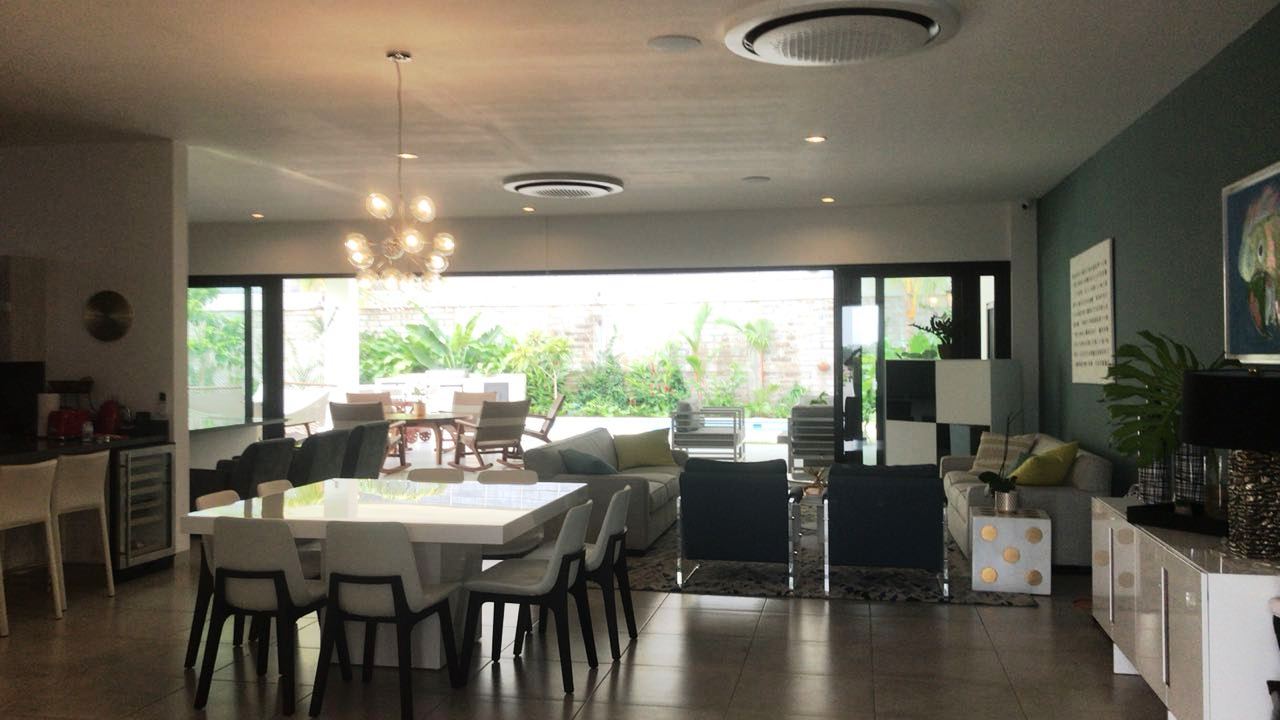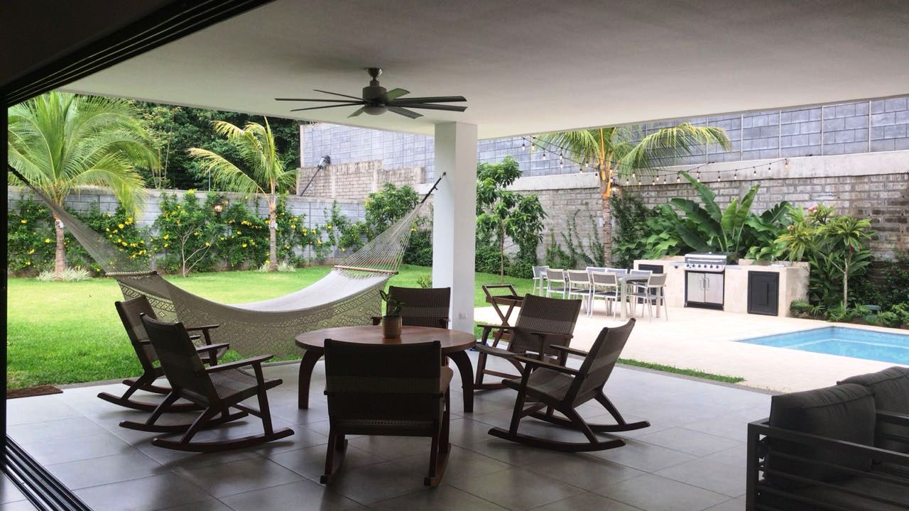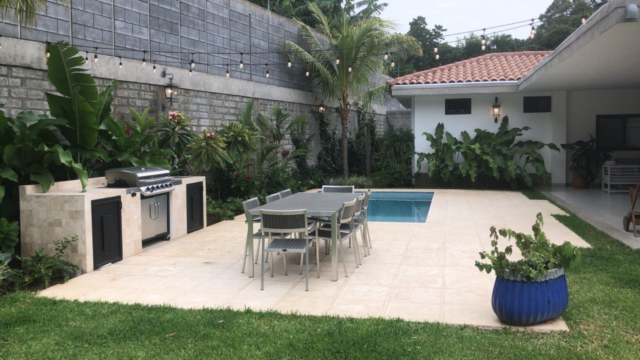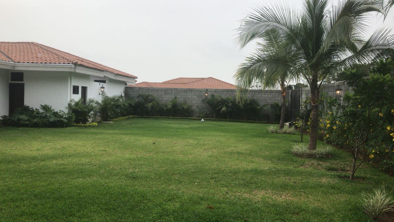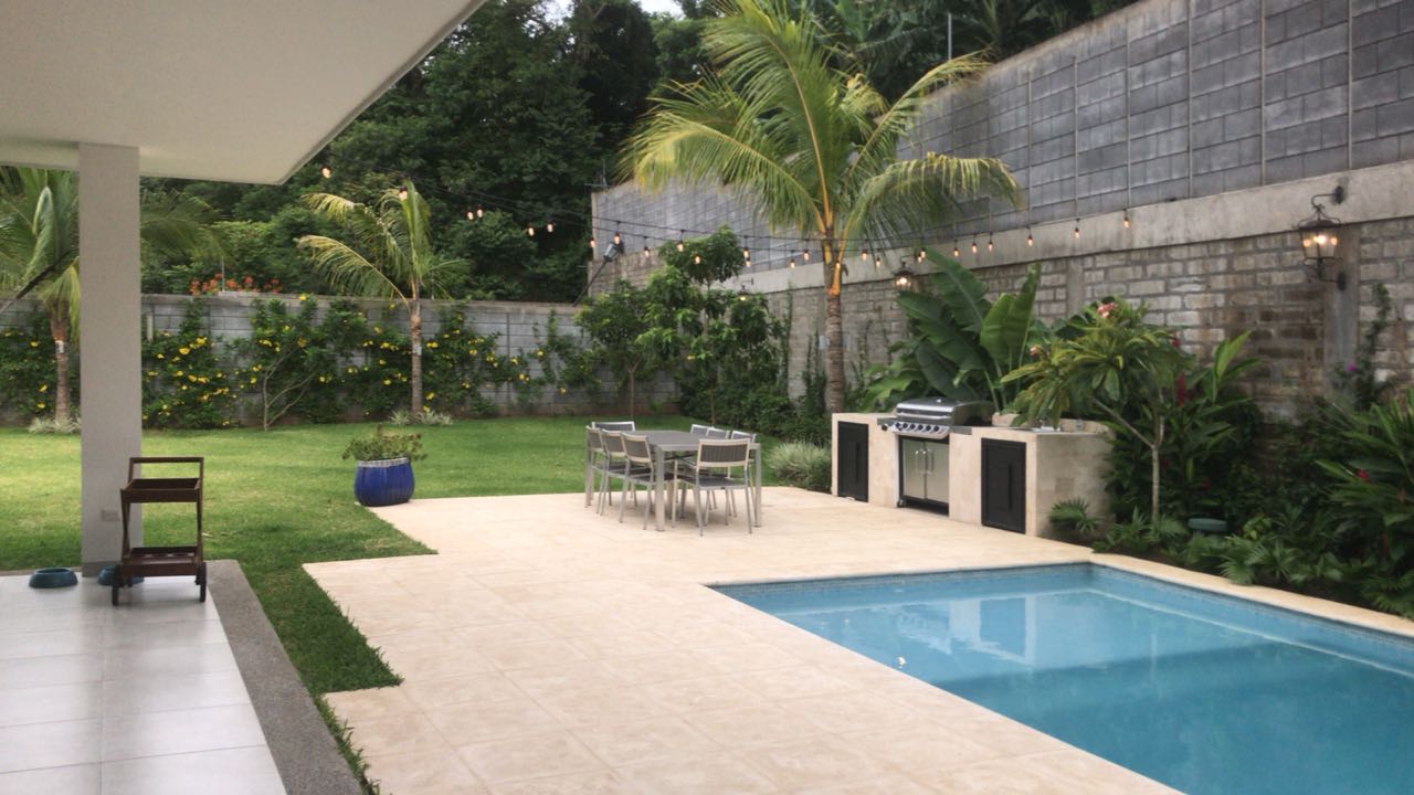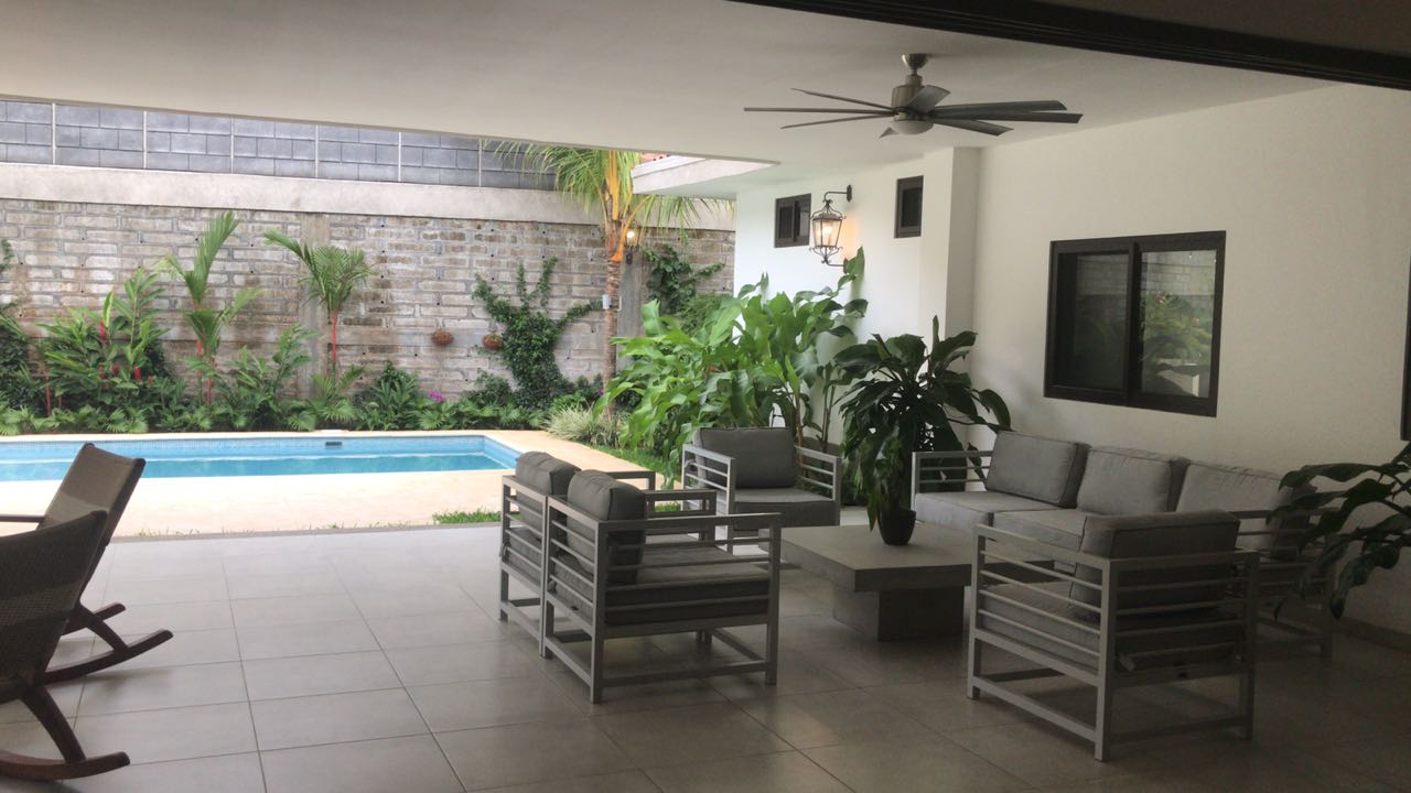 Bella casa con amplios y cómodos ambientes, excelente iluminación, ventilación, clima fresco, en una de las mejores zonas de Managua, cerca de supermercados, iglesia, restaurantes, bancos, colegios y más. La propiedad cuenta con las siguientes especificaciones: 400 mts² de construcción, 4 habitaciones, 4 baños completos, ½ baño de visitas, sala familiar, sala TV, sala, comedor, cocina, terraza techada, habitación de servicio, área de lavandería, garaje techado para dos vehículos, huellas vehiculares, aires acondicionados, abanicos de techo, agua caliente, muro perimetral, sistemas de alarma y video, sistema de sonidos, amplia área verde con jardín y piscina. RENTA INCLUYE LA SEGURIDAD