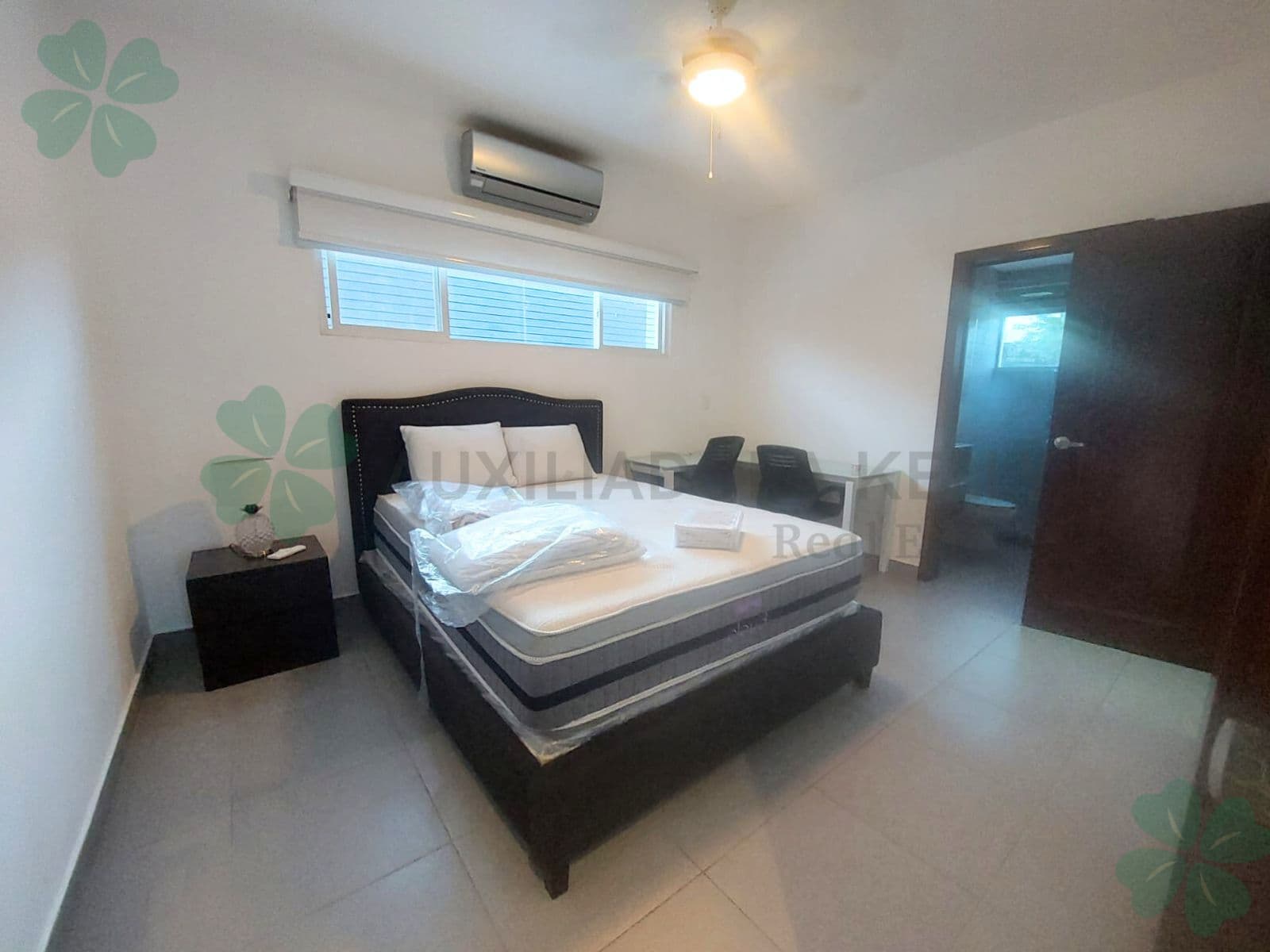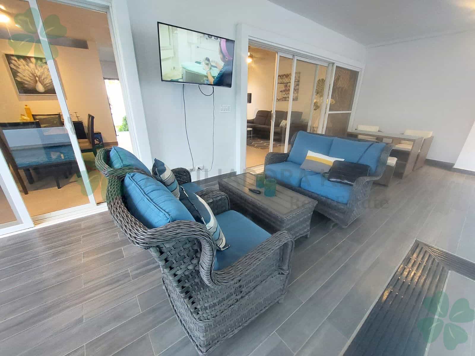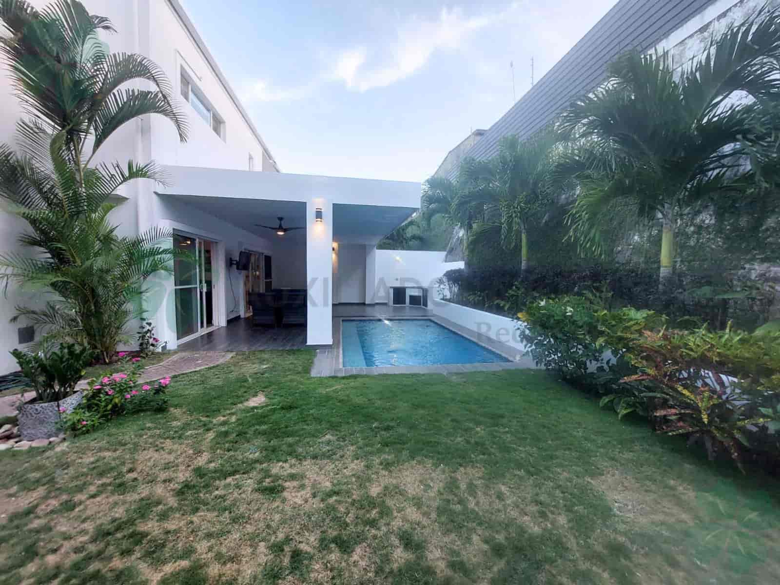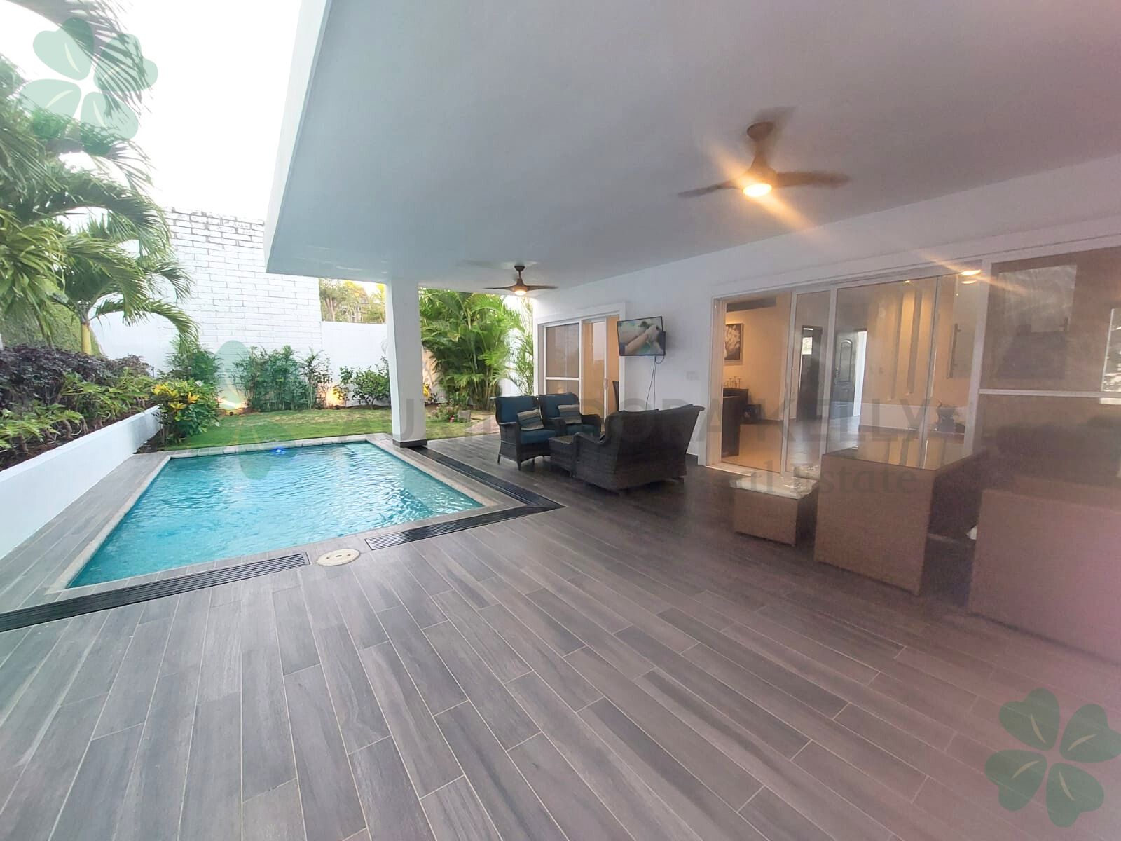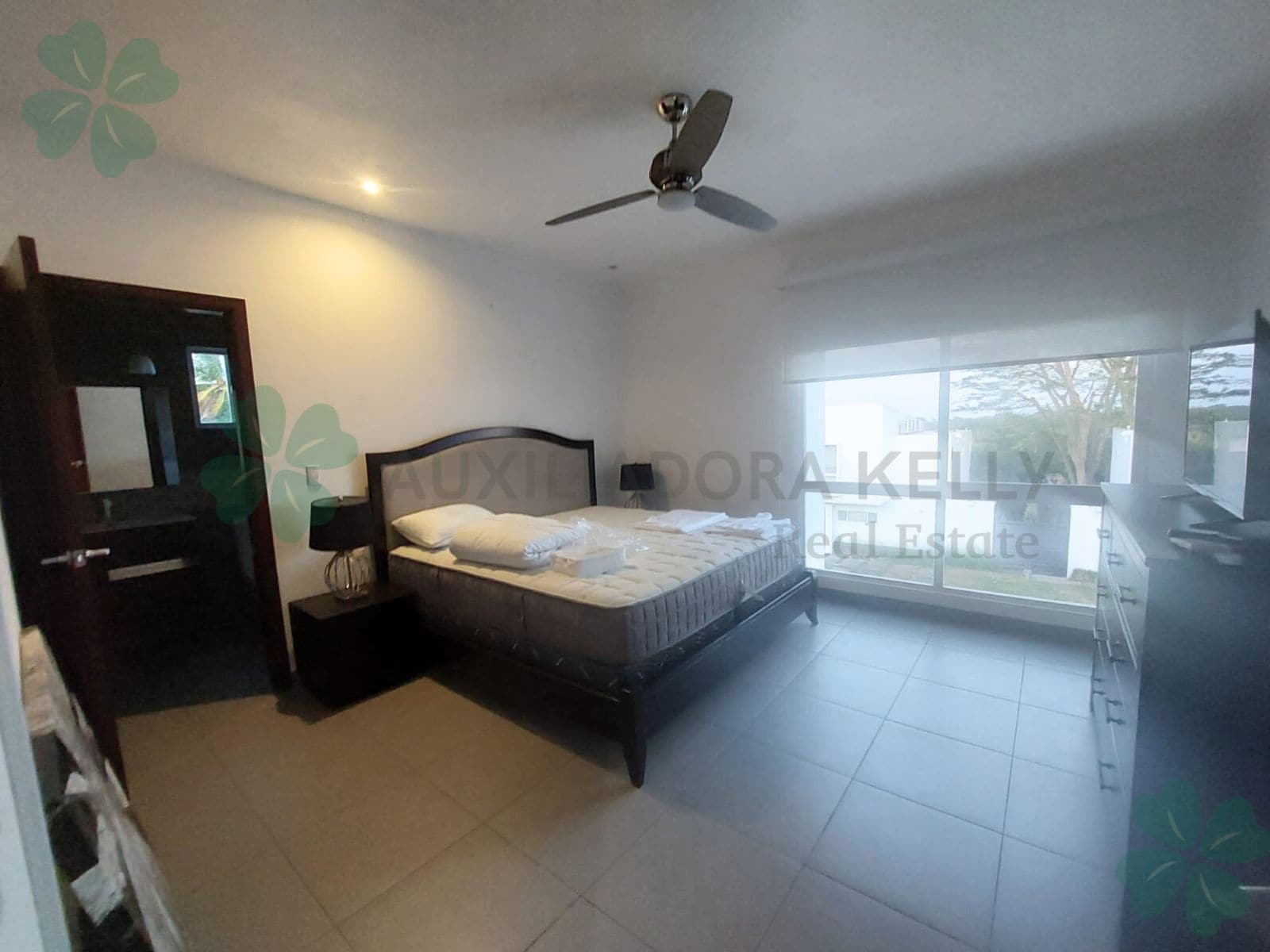 Se renta moderna casa dos plantas totalmente amueblada, ubicada en condominio privado y de alta plusvalía en Santo Domingo, con finos acabos, excelente iluminación y ventilación. La propiedad cuenta con las siguientes especificaciones: 3 habitaciones, 3 baños completos, ½ baño de visita, sala familiar, sala, comedor, cocina, terraza, habitación de servicio, área de lavandería, aires acondicionados, abanicos de techo, área verde, piscina y estacionamiento.