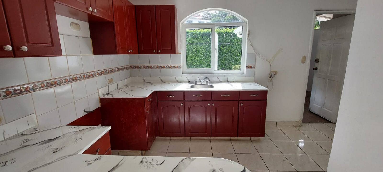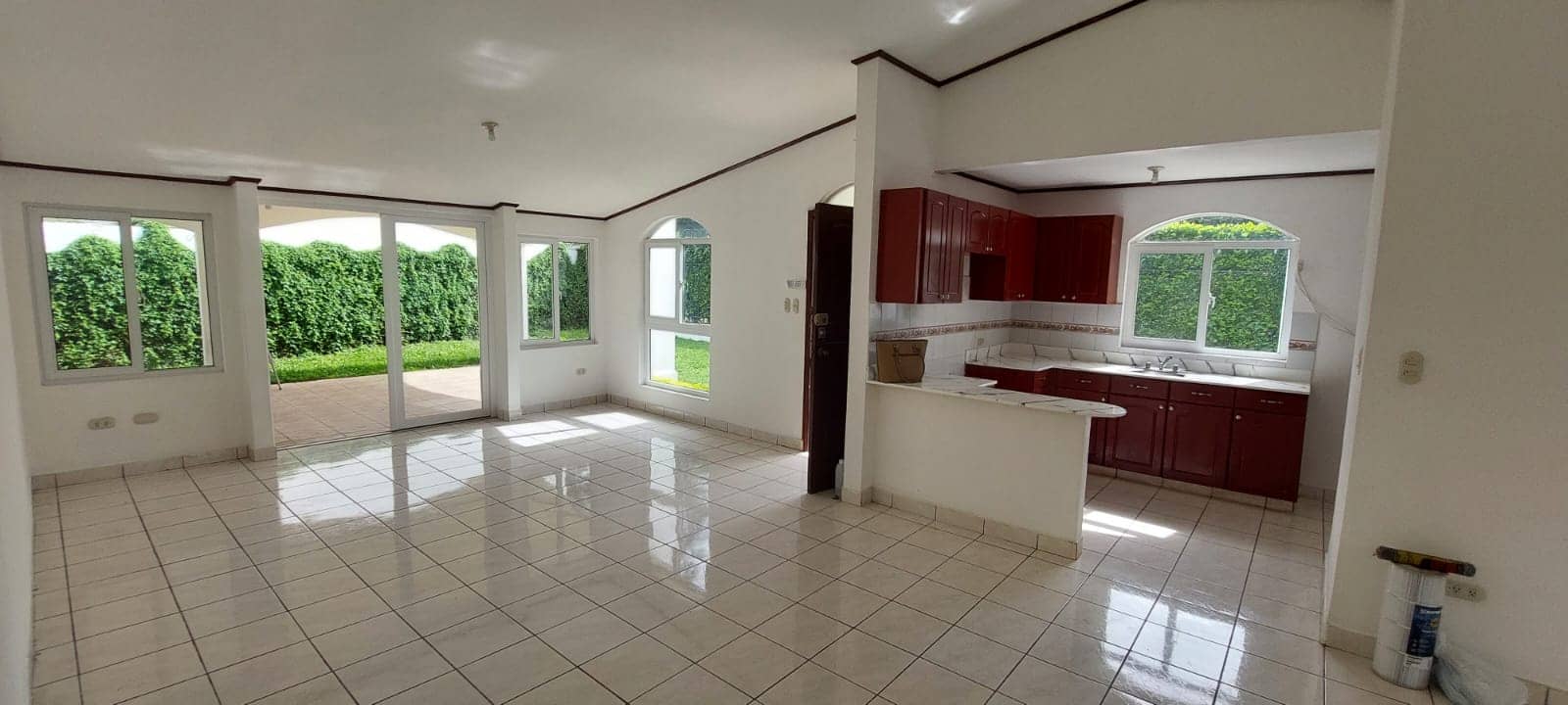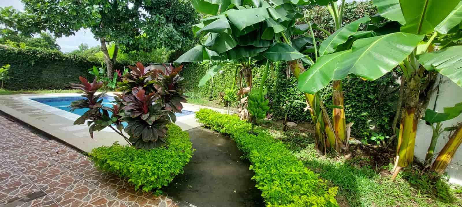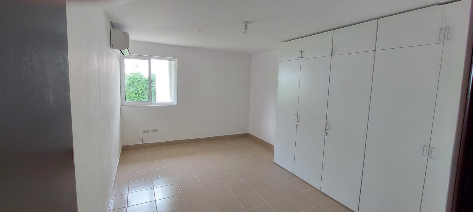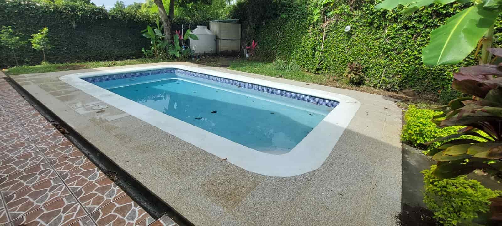 Casa en Santo Domingo con las siguientes características: 3 dormitorios, 2 aires acondicionados, 2 baños, sala, cocina, comedor, terraza, piscina, jardín, área de servicio completa y garaje para 2 vehículos.